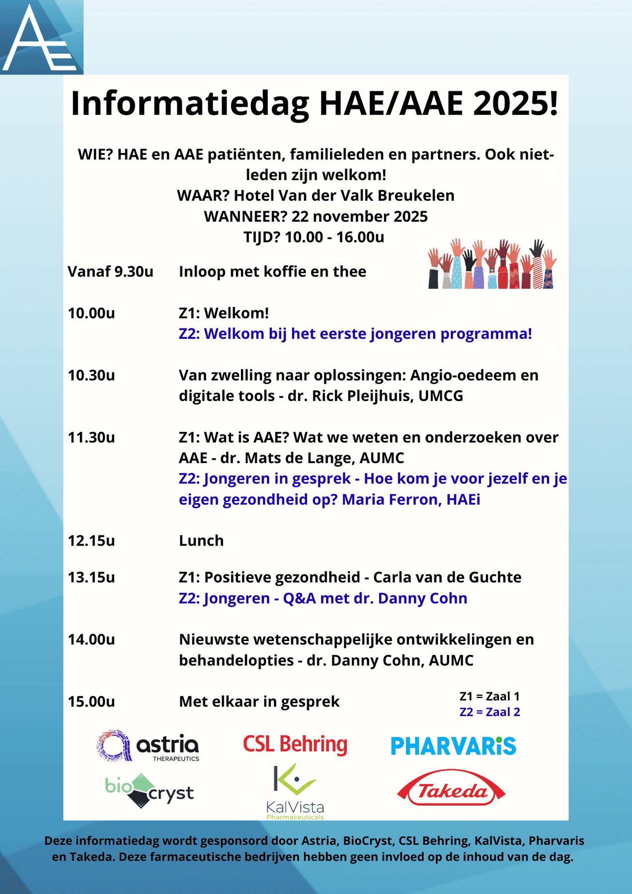 Op zaterdag 22 november 2025 organiseren wij weer de jaarlijkse Informatiedag HAE/AAE in het Van der Valk Hotel in Breukelen.